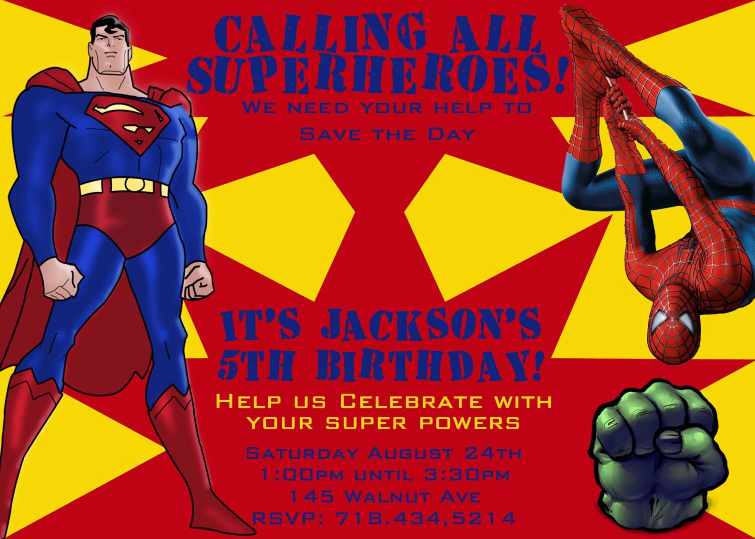 Superhero Spiderman Hulk Superman Party Birthday Invite Card